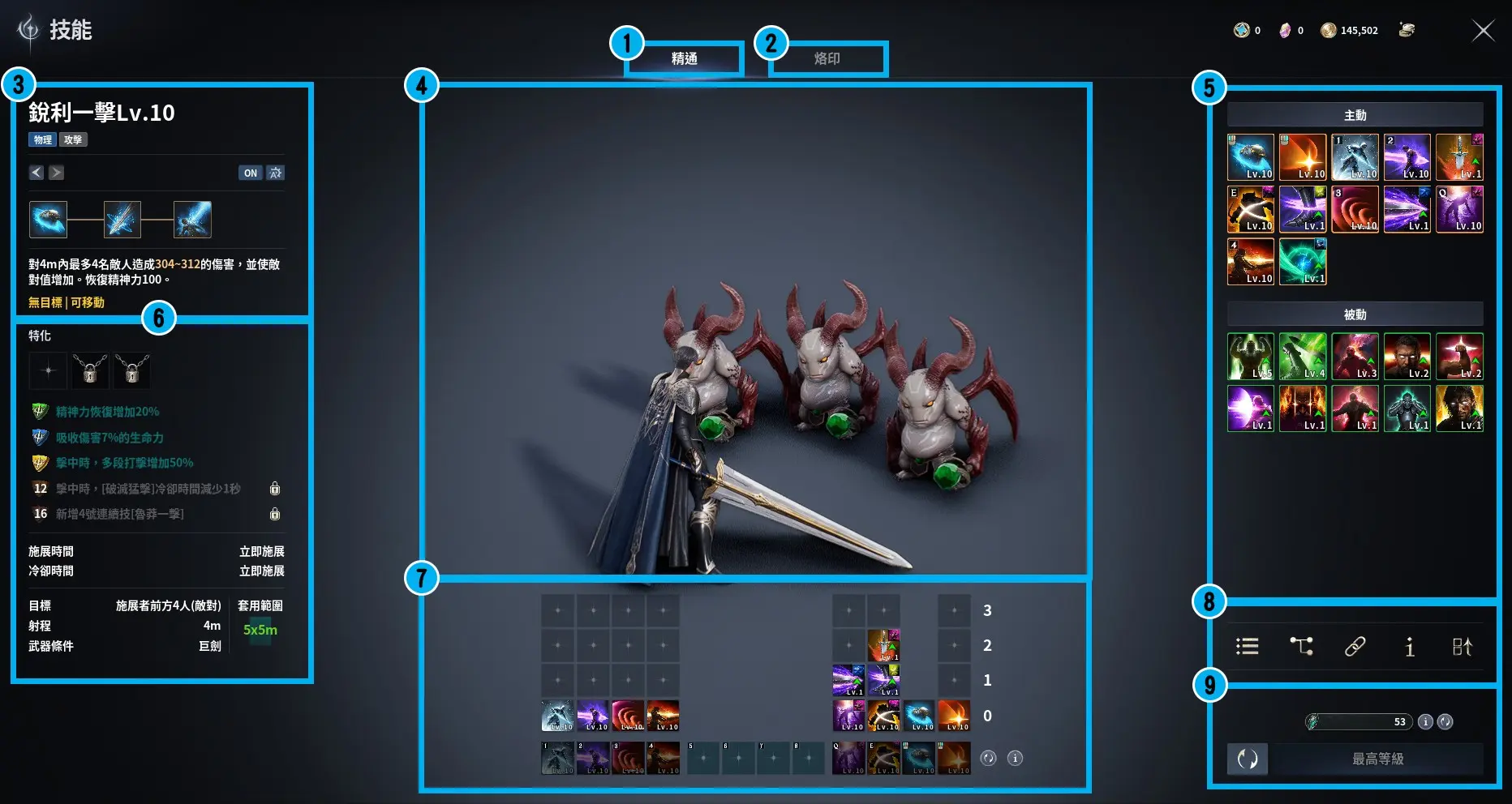 - 技能分為基本技能「精通技能」和進階技能「烙印技能」