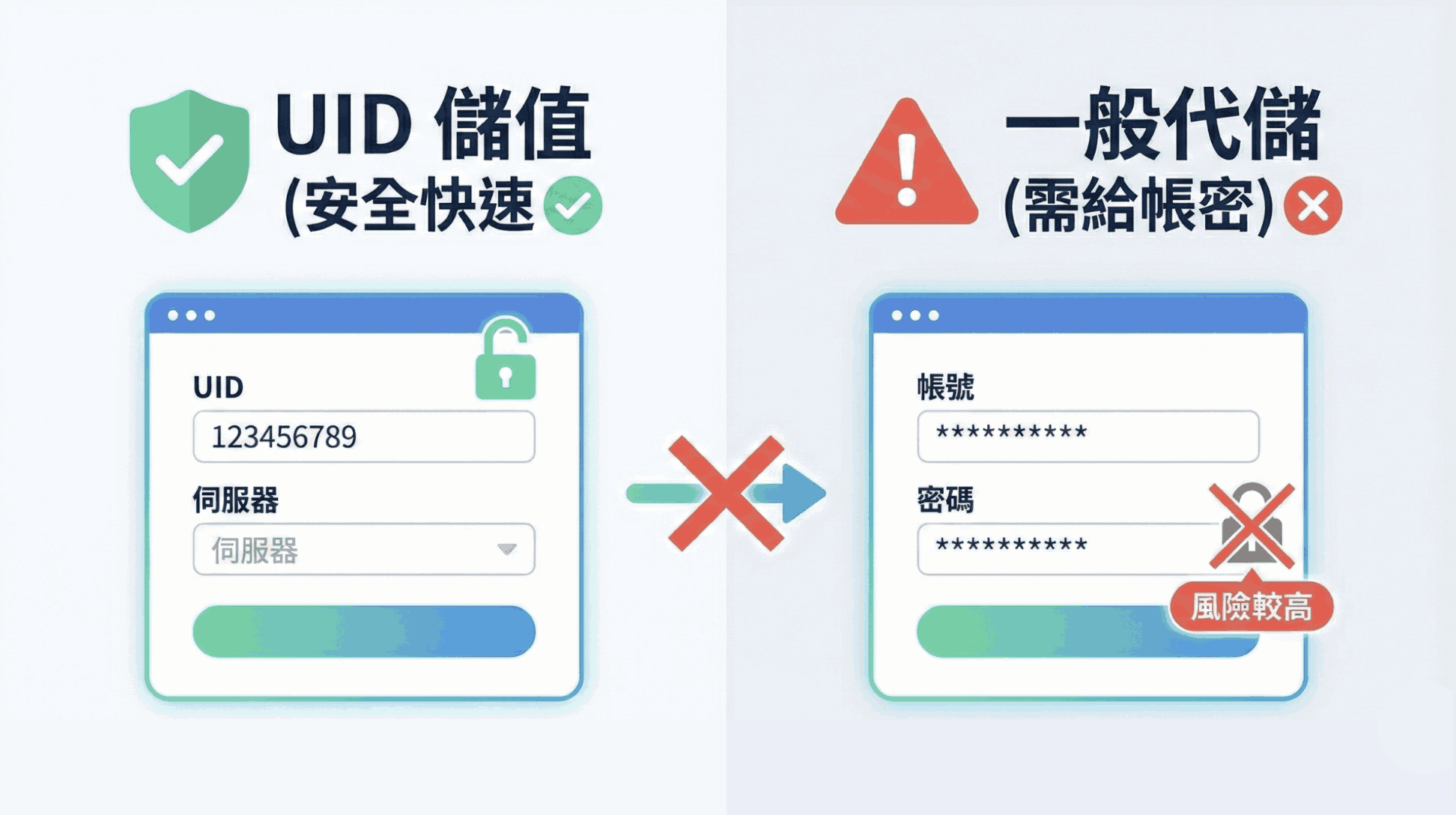 | 比較項目 | UID儲值(優豆推薦) | 傳統帳密代充 |