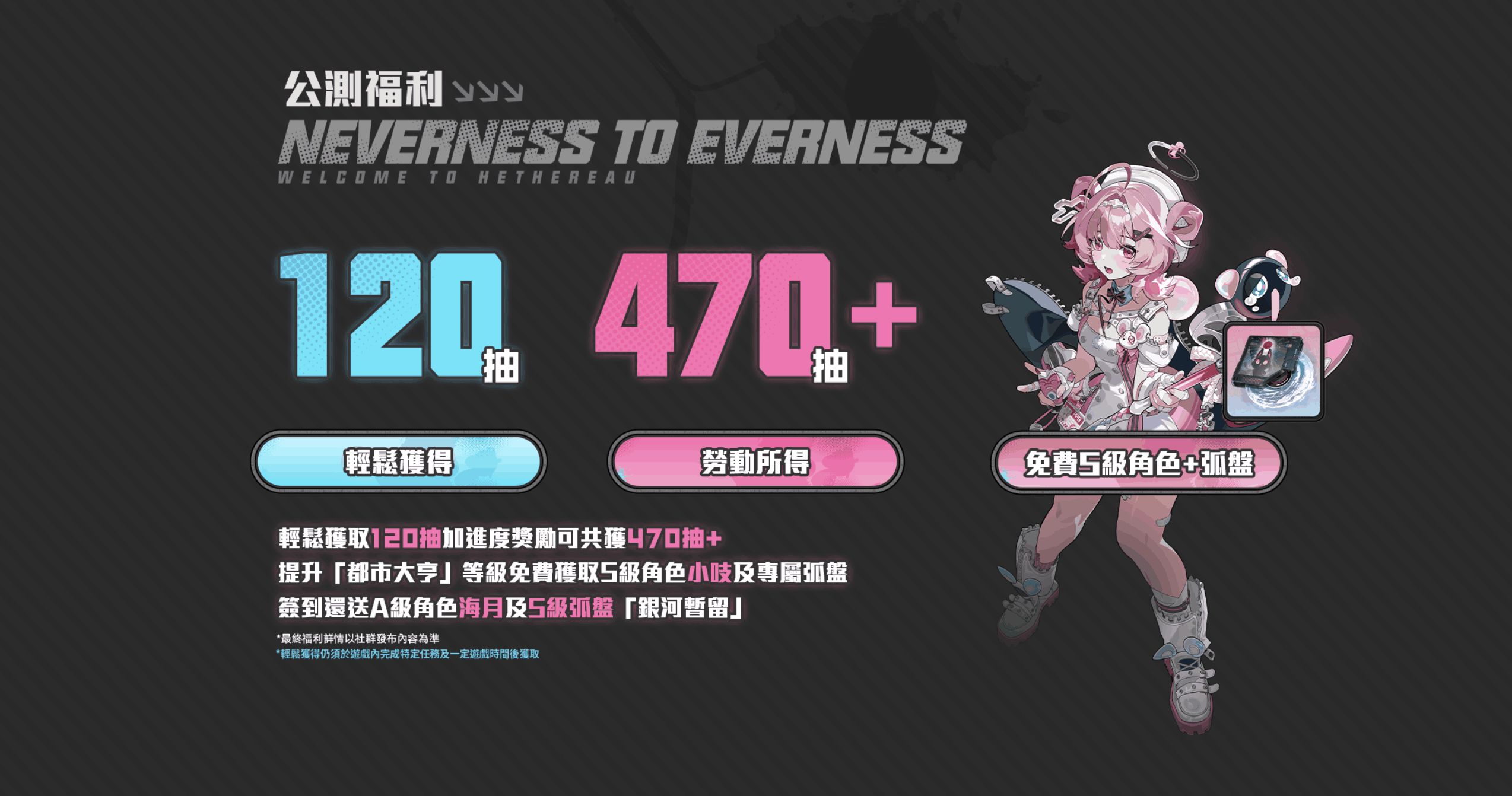 - 14 天登入好禮:累積登入可獲得 A 級角色「海月」、S 級弧盤「銀河暫留」及質實骰子。